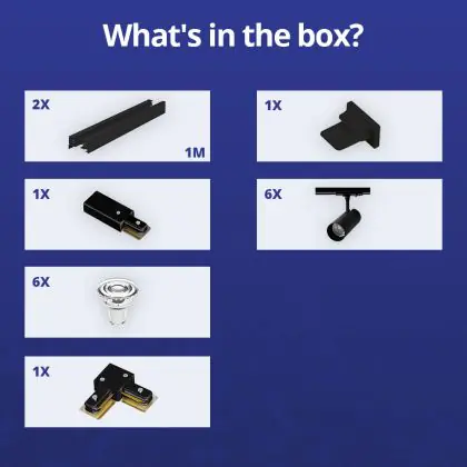| Herstellername | Complete L shaped 1-Phase Track Set Black incl. 6x Spot fixture + GU10 2700K 3W Dim – 1 x 1 meter i | |