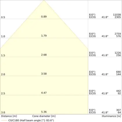 Der Abstrahlwinkel bezeichnet den Winkel, in dem das Licht aus der Lichtquelle ausgestrahlt wird. Er wird in Grad (D) angegeben. Je geringer die Gradzahl des Abstrahlwinkels ist, desto kleiner ist auch der Durchmesser des Lichtkegels, den die Lichtquelle produziert.