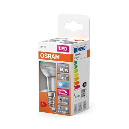 La lampe LED Osram LED Superstar Réflecteur Spot E14 R50 4.8W 345lm 36D - 940 | Meilleur Rendu De Couleur - Dimmable - Remplacement 60W avec culot E14 (Ampoule à vis petit culot) est le remplacement idéal des lampes à incandescence et halogènes classiques. En raison de la faible consommation d'énergie, vous économisez considérablement sur vos coûts d'énergie. Les lampes à LED Osram n’utilisent qu’une petite partie de la puissance (4.8 W) que les lampes à incandescence et halogènes classiques (60 W). Les lampes à LED ont une excellente classe énergétique G, ce qui signifie qu'elles sont très écologiques et peuvent être recyclées après utilisation. En raison de leur durée de vie considérable de 25000 heures, vous n’aurez pas à les changer de si tôt.